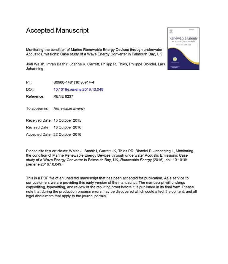 Monitoring the Condition of Marine Renewable Energy Devices through Underwater Acoustic Emissions: Case Study of a Wave Energy Converter in Falmouth Bay, UK 40 33 View details Download