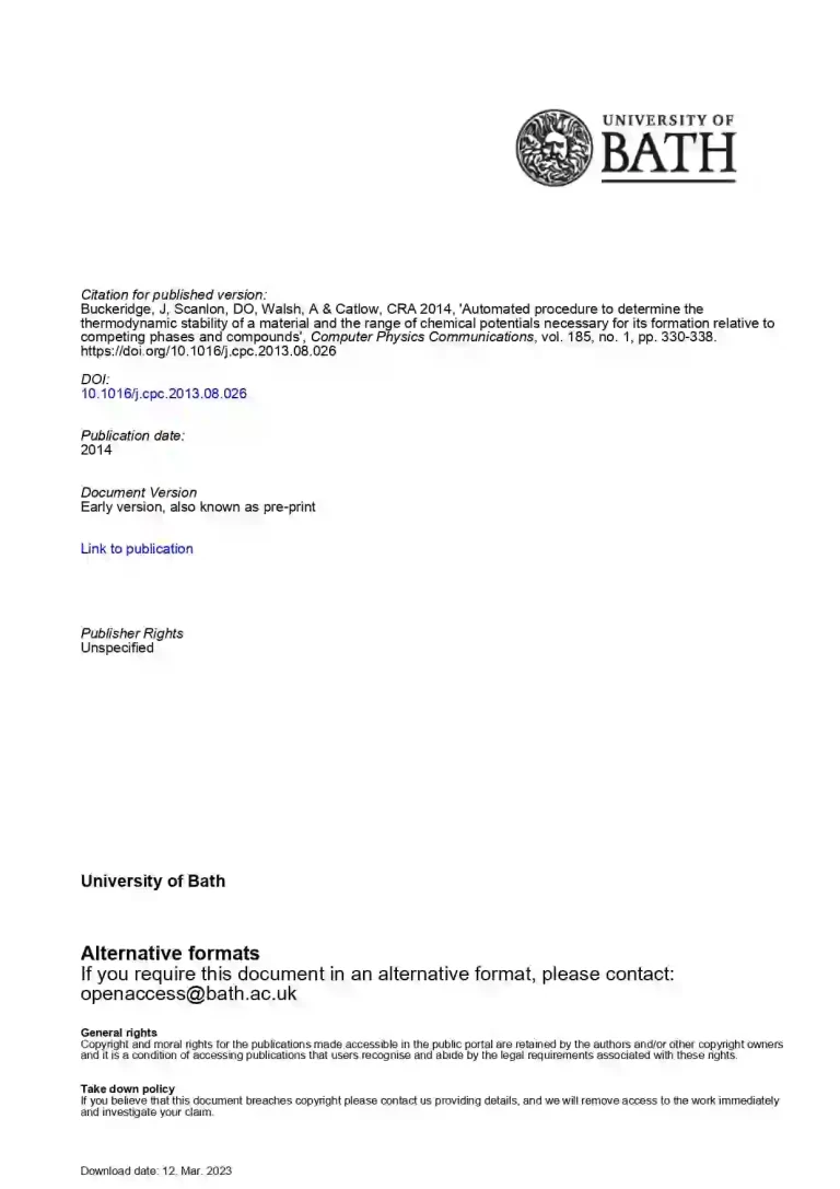 Automated procedure to determine the thermodynamic stability of a material and the range of chemical potentials necessary for its formation relative to competing phases and compounds 38 25 View details Download