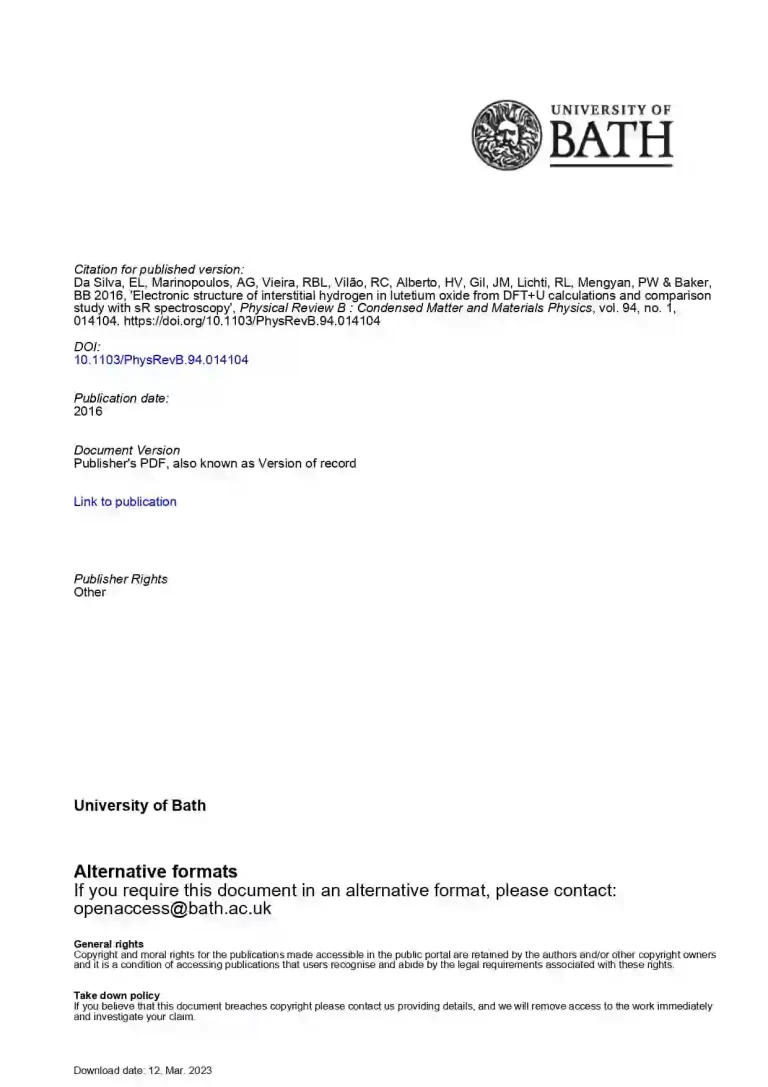 Electronic structure of interstitial hydrogen in lutetium oxide from DFT+U calculations and comparison study with μSR spectroscopy 35 15 View details Download
