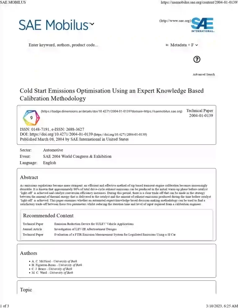Cold Start Emissions Optimisation Using an Expert Knowledge Based Calibration Methodology 38 18 View details Download