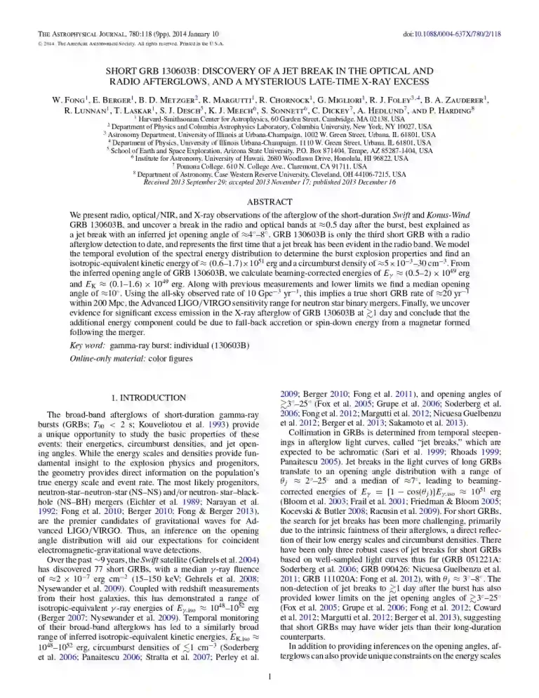 Short GRB 130603b: Discovery of a Jet Break in the Optical and Radio Afterglows, and a Mysterious Late-Time X-Ray Excess 35 0 View details