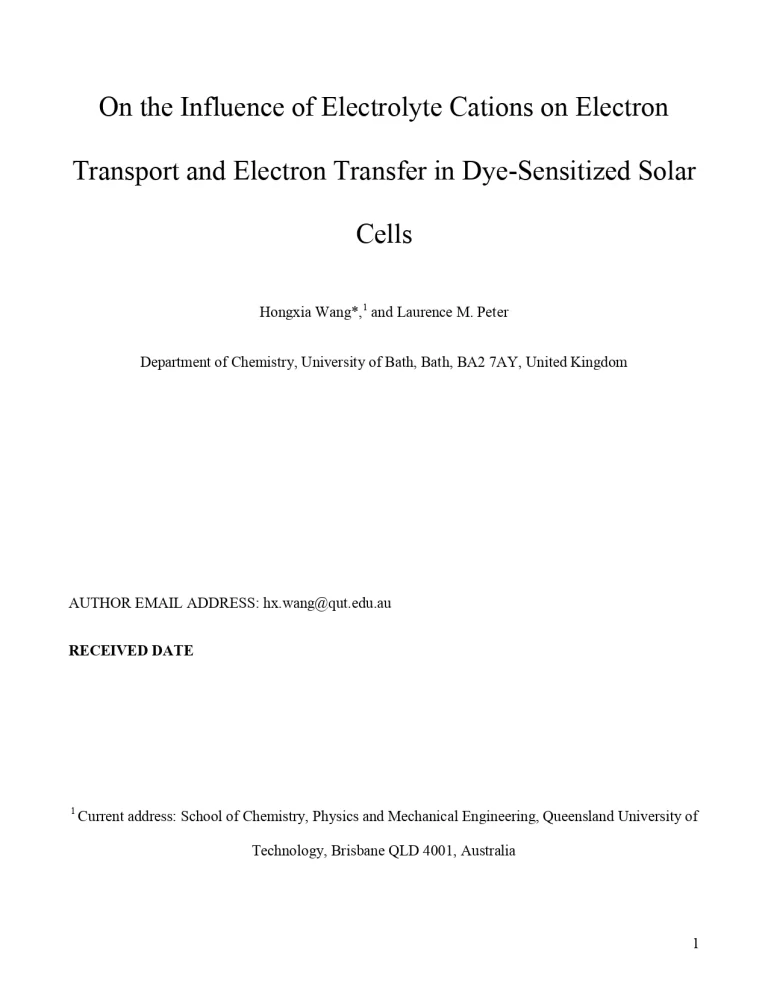 On the Influence of Electrolyte Cations on Electron Transport and Electron Transfer in Dye-Sensitized Solar Cells 31 20 View details Download