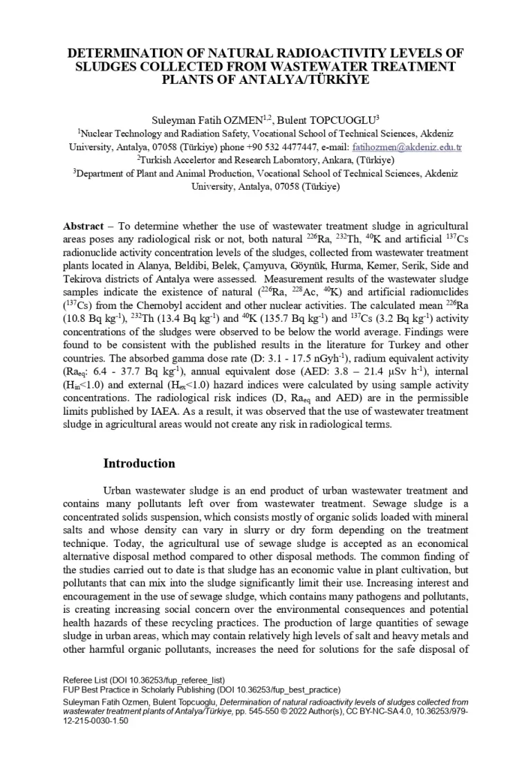 Determination of natural radioactivity levels of sludges collected from wastewater treatment plants of Antalya Türkiye 65 33 View details Download