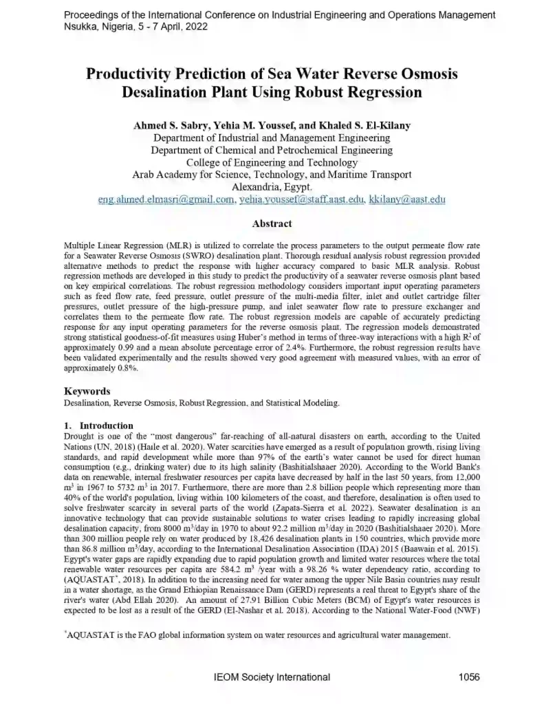 Productivity Prediction of Sea Water Reverse Osmosis Desalination Plant Using Robust Regression