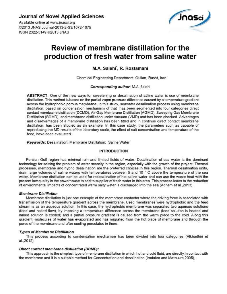 Review of Membrane Distillation For The Production of Fresh Water From saline water