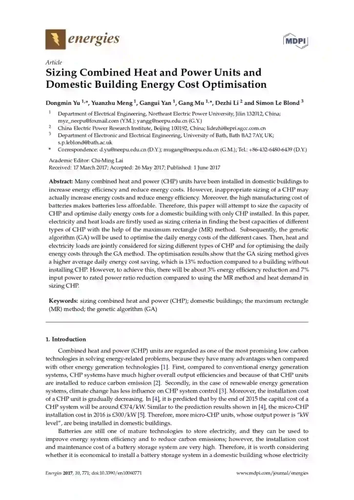 Sizing Combined Heat and Power Units and Domestic Building Energy Cost Optimisation