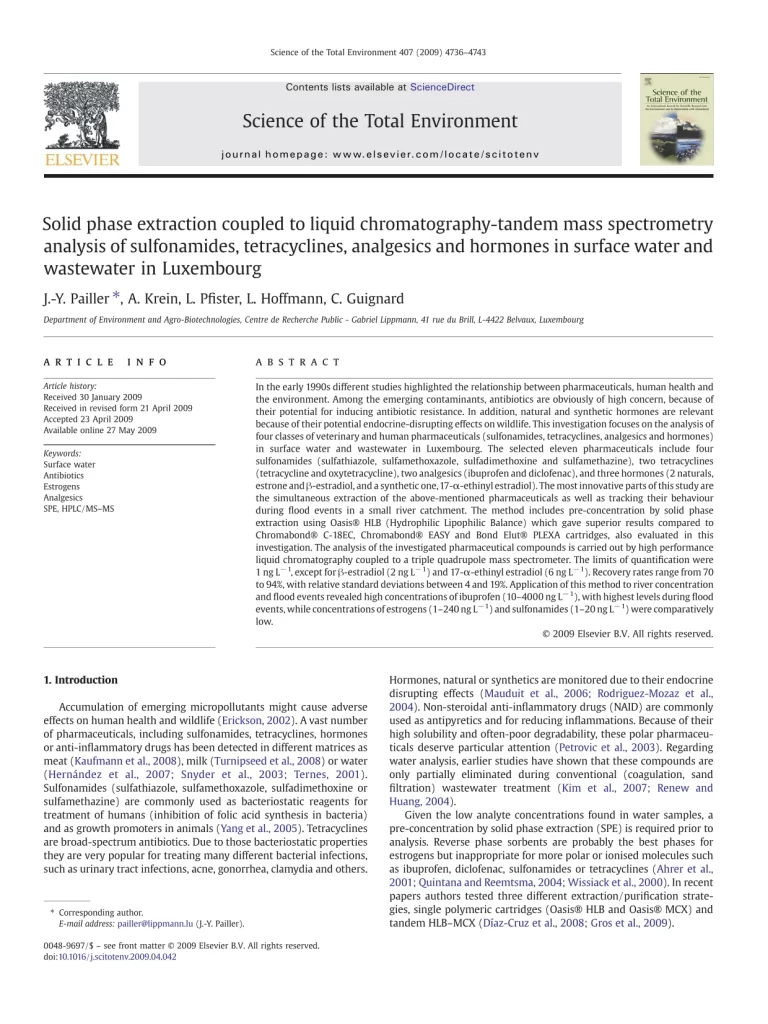 Solid Phase Extraction Coupled to Liquid Chromatography-Tandem Mass Spectrometry Analysis of Sulfonamides, Tetracyclines, Analgesics and Hormones in Surface Water and Wastewater