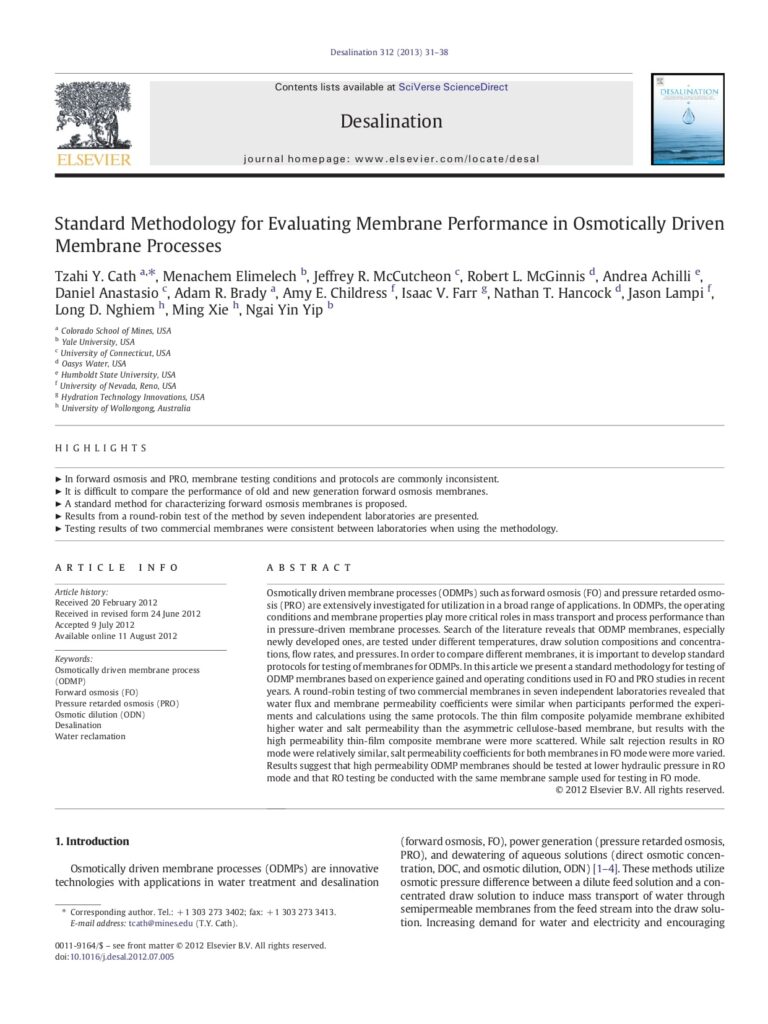Standard Methodology for Evaluating Membrane Performance in Osmotically Driven Membrane Processes