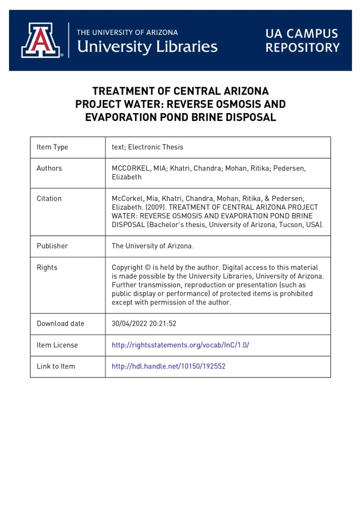 TREATMENT OF CENTRAL ARIZONA PROJECT WATER ,REVERSE OSMOSIS AND EVAPORATION POND BRINE DISPOSAL