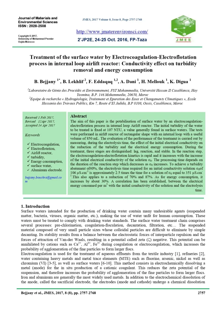 Treatment Of The Surface Water By Electrocoagulation-Electroflotation Process In Internal Loop Airlift Reactor Conductivity Effect On Turbidity Removal And Energy Consumption
