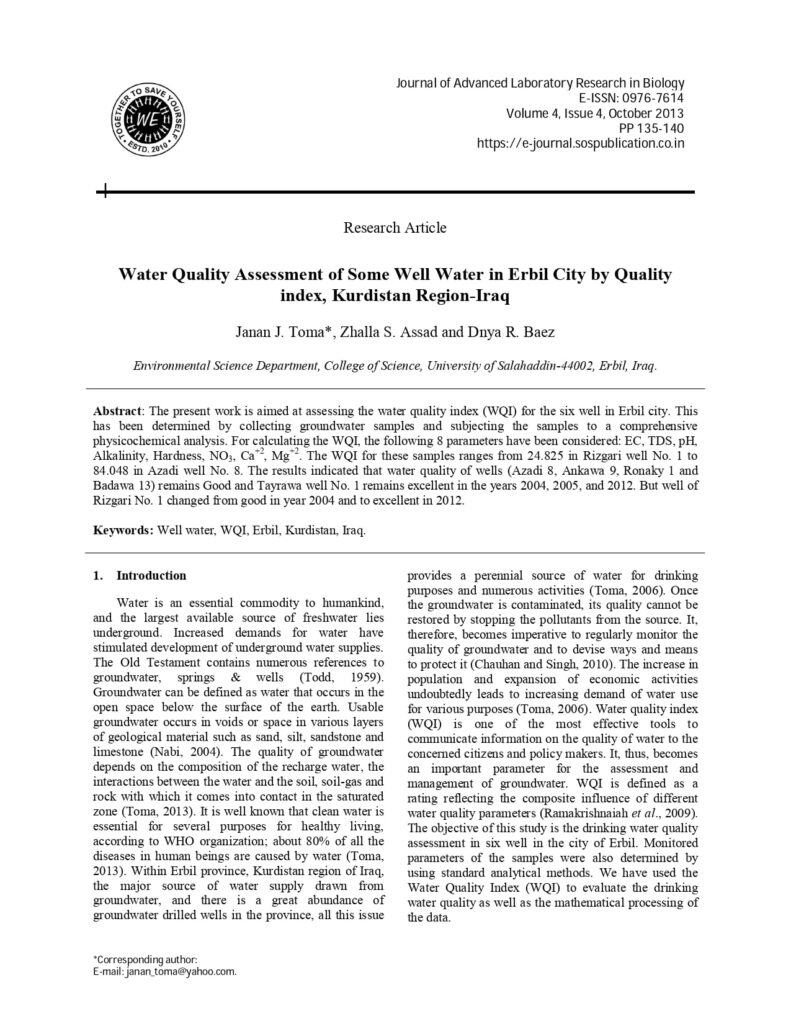 Water Quality Assessment of Some Well Water in Erbil City by Quality Index, Kurdistan Region-Iraq