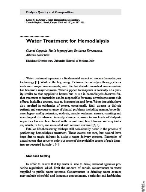 Water treatment represents a fundamental aspect of modern hemodialysis technology [1]. While at the beginning of chronic hemodialysis therapy, chemicals were major contaminants, over the last decade microbial contamination has become a major concern. Water supplied to hospitals is normally of a quality similar to that supplied to homes but its use in hemodialysis deserves further treatment as impurities can be responsible for many unwelcome acute side effects, including cramps, nausea, hypotension and fever. Water impurities have also resulted in epidemics of severe, occasionally fatal, disease in dialysis patients and can cause a range of clinical problems including anemia, bone disease, hyper- and hypotension, acidosis, muscle weakness, nausea, vomiting and neurological disturbance. Recently, chronic exposure to low levels of dialysate impurities has also been linked with malnutrition, heart disease and amyloidosis, which, in turn, are associated with reduced survival. Fatal or life-threatening mishaps still occasionally occur in the process of performing hemodialysis treatment.