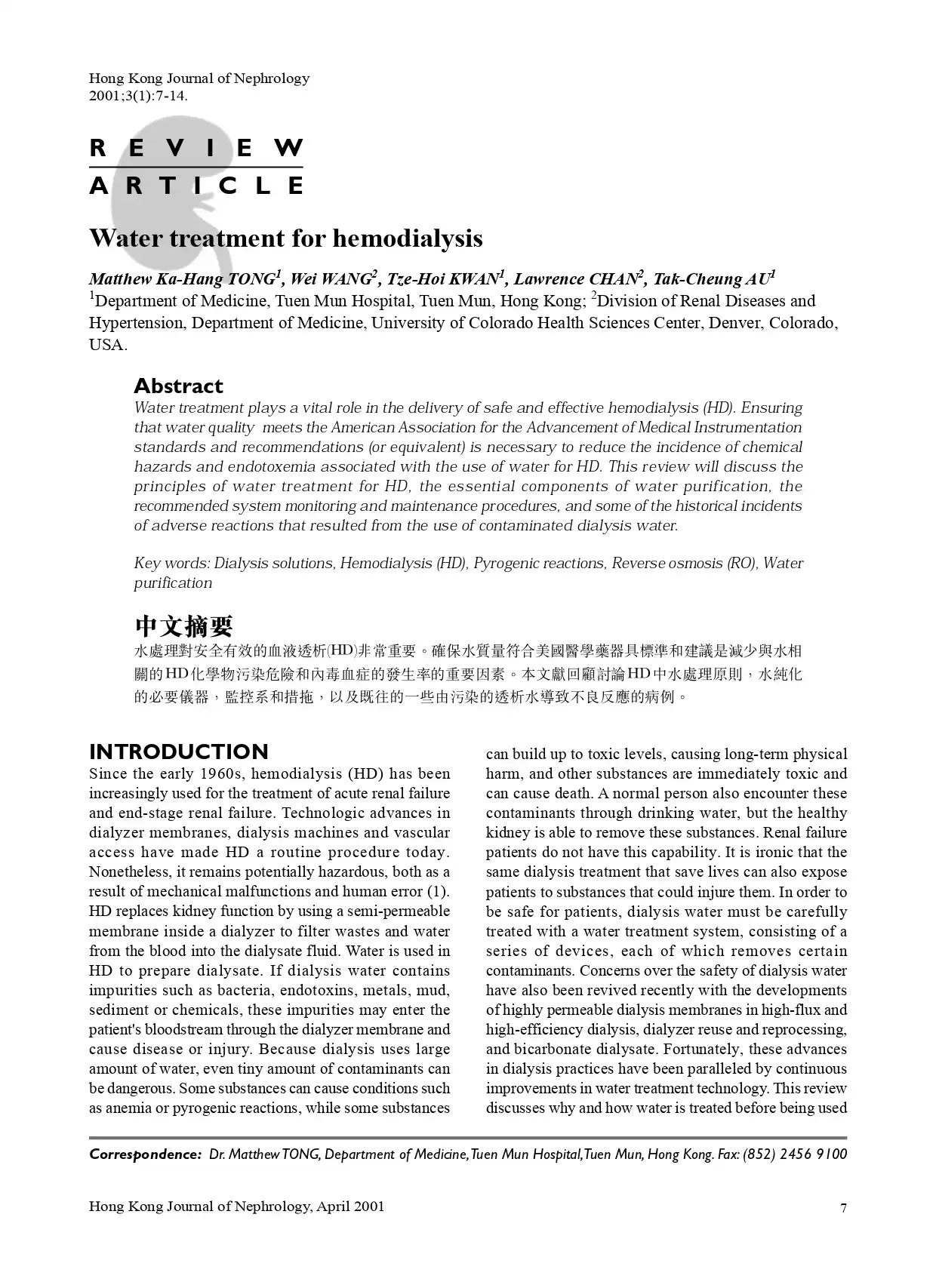 Water treatment plays a vital role in the delivery of safe and effective hemodialysis (HD). Ensuring that water quality meets the American Association for the Advancement of Medical Instrumentation standards and recommendations (or equivalent) is necessary to reduce the incidence of chemical