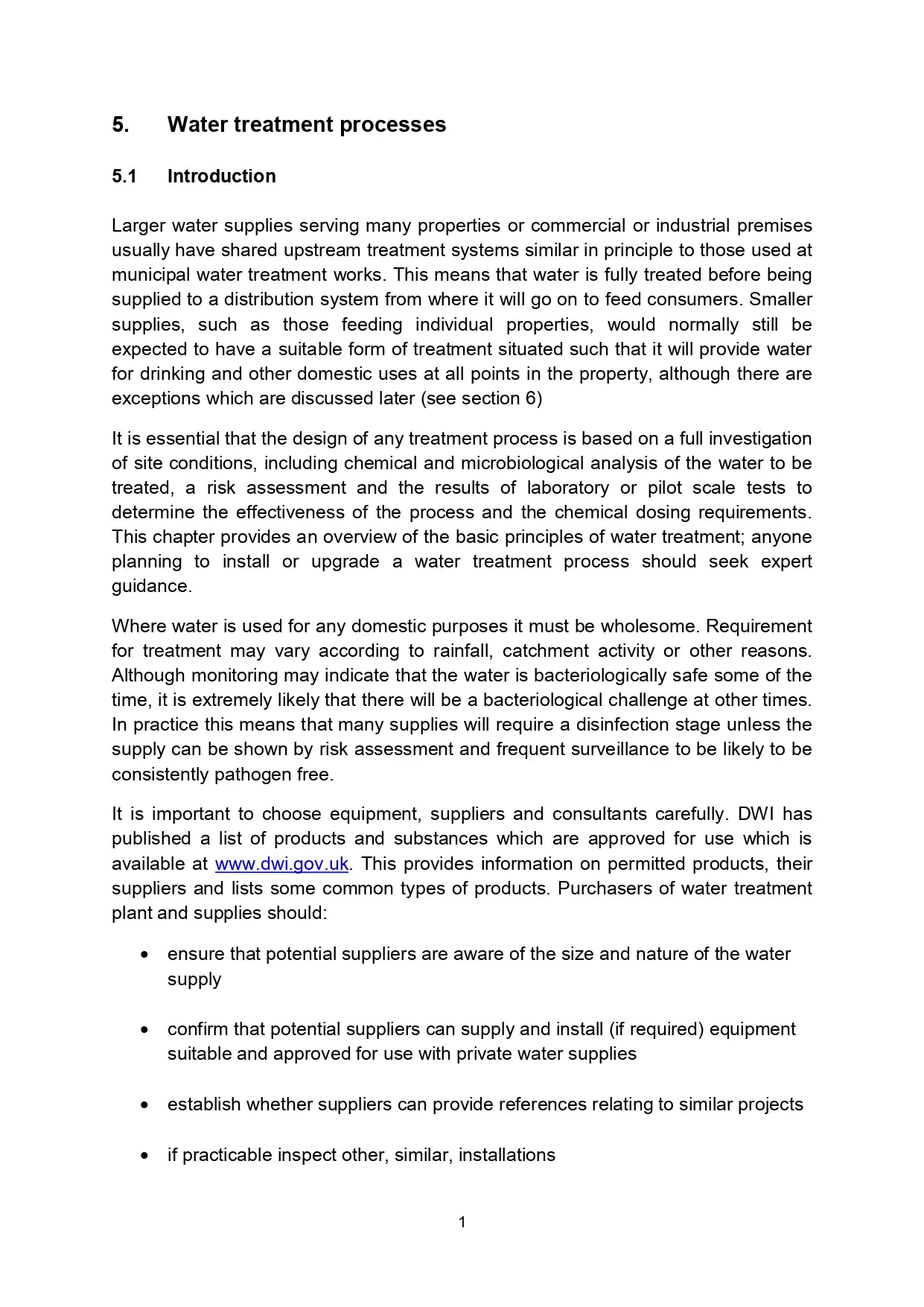 Larger water supplies serving many properties or commercial or industrial premises usually have shared upstream treatment systems similar in principle to those used at municipal water treatment works. This means that water is fully treated before being supplied to a distribution system from where it will go on to feed consumers. Smaller supplies, such as those feeding individual properties, would normally still be expected to have a suitable form of treatment situated such that it will provide water for drinking and other domestic uses at all points in the property, although there are exceptions which are discussed later . It is essential that the design of any treatment process is based on a full investigation of site conditions, including chemical and microbiological analysis of the water to be treated, a risk assessment and the results of laboratory or pilot scale tests to determine the effectiveness of the process and the chemical dosing requirements. This chapter provides an overview of the basic principles of water treatment; anyone planning to install or upgrade a water treatment process should seek expert guidance.