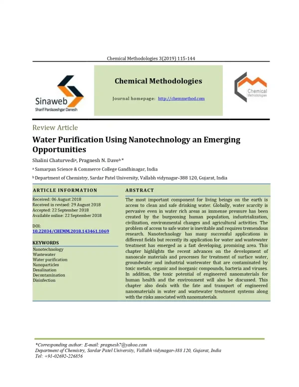 Abstract : The most important component for living beings on the earth is access to clean and safe drinking water. Globally, water scarcity is pervasive even in water rich areas as immense pressure has been created by the burgeoning human population, industrialization, civilization, environmental changes and agricultural activities. The problem of access to safe water is inevitable and requires tremendous research. Nanotechnology has many successful applications in different fields but recently its application for water and wastewater treatment has emerged as a fast developing, promising area. This